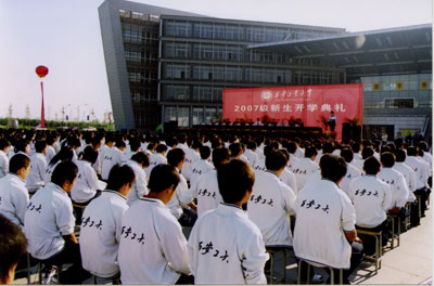 (本网讯)金风送爽,天高云淡,9月14号上午,ac米兰官方网站未央校区彩旗飘飘、歌声嘹亮,2007级新生开学典礼在图书馆前广场举行。校党委书记赛云秀,校长刘江南,党委副书记简林根、丁养斌,副校长张君安、刘建勋、陈俊斌,校长助理陈桦出席,教务处、学生处、校团委及各院系部负责人和2007级新生参加了开学典礼。开学典礼在庄严的国歌声中拉开序幕。