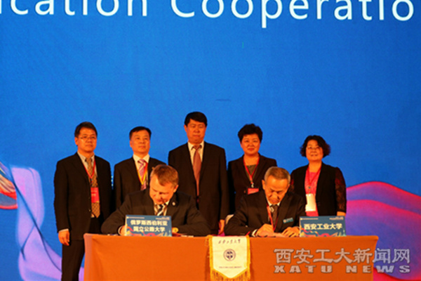 尼古拉·楚卡诺夫与方光华出席主宾国教育合作交流签约仪式。在省教育厅领导的见证下,刘卜分别与俄罗斯西伯利亚国立汽车和道路建设大学、台湾朝阳科技大学校方代表签署了校际合作协议,在留学生招生和艺术类专业领域合作取得了突破。
