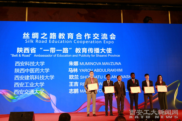 开幕式颁奖环节,ac米兰外国留学生王吉获陕西省“一带一路”教育传播大使殊荣并接受颁奖。