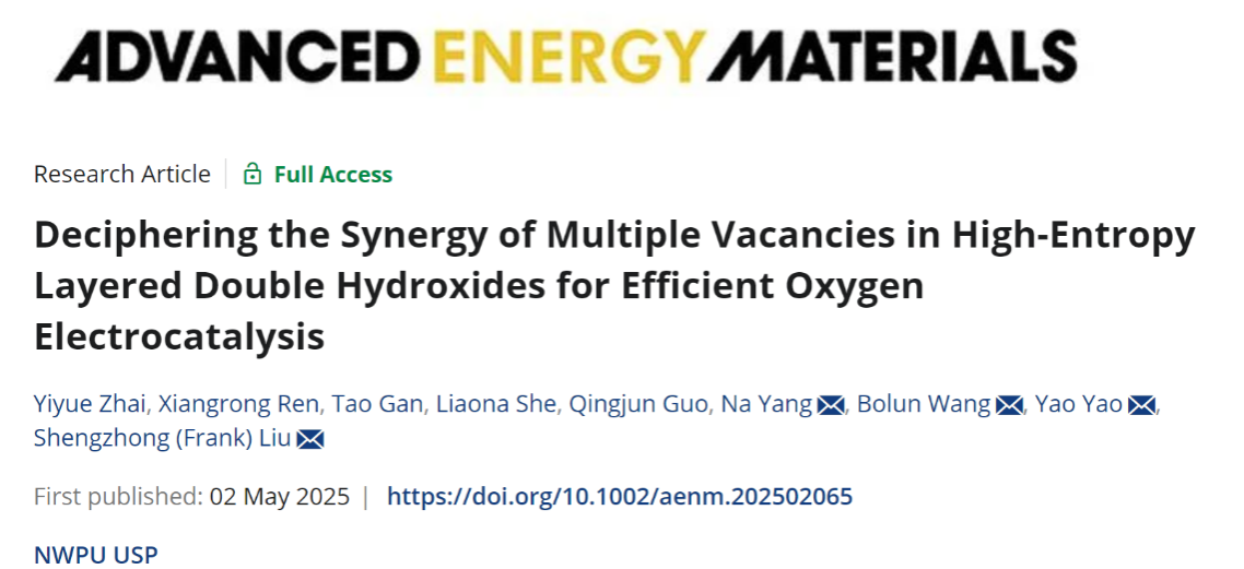 (本网讯)近日,ac米兰姚尧教授团队在国际顶级期刊《Advanced Energy Materials》(近五年影响因子为27.3)上发表“Deciphering the Synergy of Multiple Vacancies in High-Entropy Layered Double Hydroxides for Efficient Oxygen Electrocatalysis”的研究型论文。