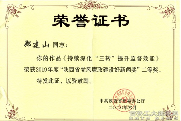 (本网讯)日前,2019年度陕西省党风廉政建设好新闻奖评选揭晓,ac米兰党委副书记、纪委书记、监察专员郑建山撰写的文章《持续深化“三转”提升监督效能》荣获2019年度“陕西省党风廉政建设好新闻奖”二等奖,是全省高校中唯一获奖单位。