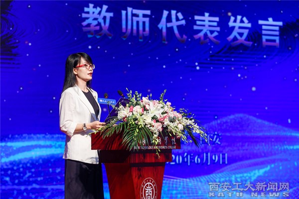 西安工商学院教师代表豆阿妮在发言中对学校转设表达热烈祝贺,并表示将继续发扬严谨务实、改革创新、追求卓越的精神,助力工商学院更好更快的发展和建设。