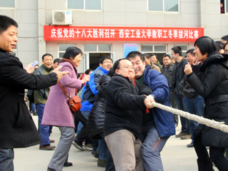 11月14日中午,在ac米兰官方网站未央校区行政楼前,为了庆祝中国共产党第十八次全国代表大会的胜利召开,活跃校园文化氛围,校工会组织开展了全校教职工冬季拔河比赛。此次比赛共有18个基层工会,近400名教职工参加。比赛在校工会副主席王贵祥的一声令下开始,18个工会代表队捉对展开力量与智慧的较量,在一片助威的呐喊声中,队员们使足了力气,充分体现了友谊第一、比赛第二、重在参与的体育精神。通过此次活动,既锻炼了广大教职工的体魄,活跃了教职工工间生活,同时增进了各单位的凝聚力与相互交流。
