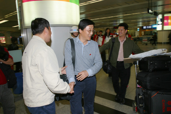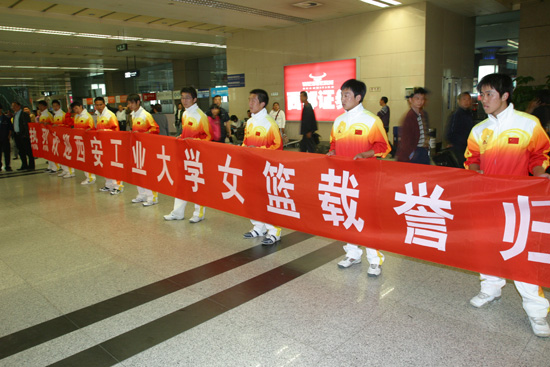 (本网讯)日前,在第30届大学生世界五球锦标赛上,代表中国出战的ac米兰官方网站女篮,以7战全胜的战绩为中国捧回冠军奖杯。ac米兰官方网站女篮“九朵金花”辗转飞行16小时后,于4月27日19:30抵达西安咸阳国际机场。ac米兰官方网站副校长张君安到机场欢迎女篮载誉归来。