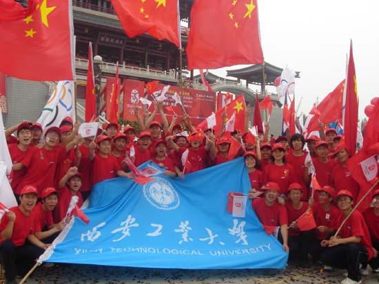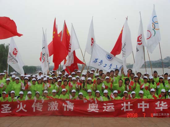 火炬传递现场,西安工大学生方阵组织有序、精神饱满、彩旗飞舞、气氛热烈,“中国加油、北京加油、奥运加油”、“点燃激情传递梦想”的呐喊声响彻大唐芙蓉园上空,充分表达了师生们对奥运的期盼和对祖国的祝福。现场的同学们激动地说:火炬传递让我们感受了奥运的无限激情和魅力,也让我们为祖国的发展和强大感到激动和自豪。2008北京奥运会即将召开,我们共同期待中国向世界展示自己独特的风采,也祝愿北京奥运会圆满成功!