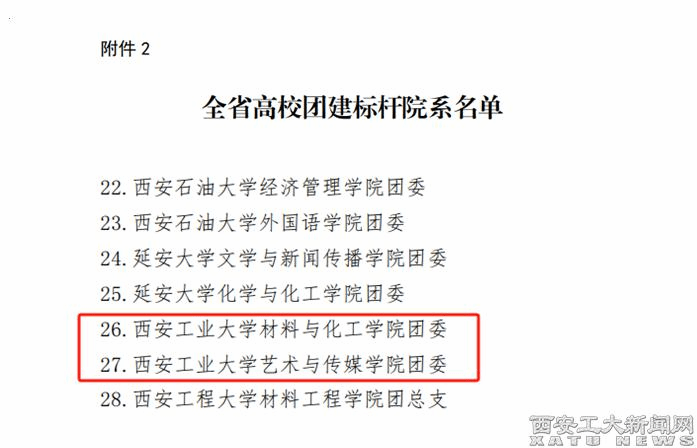 (本网讯)近日,共青团陕西省委、中共陕西省委教育工委联合下发了《关于全省学校团建示范培育结果的通报》,ac米兰通过验收被认定为“全省高校团建示范院校”,材料与化工学院团委、艺术与传媒学院(设计学院)团委获批“全省高校团建标杆院系”。