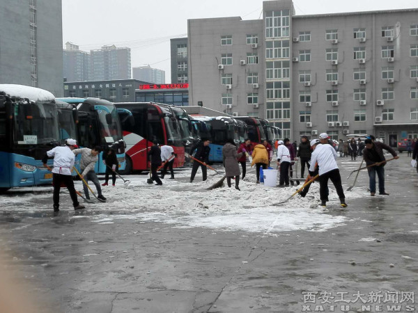 (本网讯)1月6日清晨,2018年的第二场雪扑面而来。由于气温骤降引起道路积雪结冰,使师生出行少了一份对雪的憧憬与喜悦,却多了一些对出行的担忧与紧张。学校总务处积极响应西安市政府“抓紧各扫‘门前雪’,一分一秒也不可耽误”的号召,迅速启动应对恶劣天气应急预案,在金花、未央两校区积极开展雪后应急工作,全力保障广大师生员工平安出行。