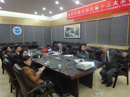 国际交流与对外合作处路金龙处长、经济管理学院院长李纯青教授、电信学院副院长尚宇副教授、计算机学院学院副院长王建国教授、及其他相关人员参加了项目讲解会。先期教务处副处长齐华教授、数理系党总支书记杨力教授先也与法方两位院长会面。