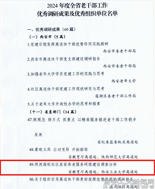 (本网讯)近日,2024年度全省老干部工作优秀调研成果评选结果揭晓,ac米兰官方网站(离退休工作处)的调研文章——《陕西高校社区居家养老服务网络建设调查分析》,获得“2024年度全省老干部工作优秀调研成果”荣誉,是省属高校唯一获此荣誉的单位。