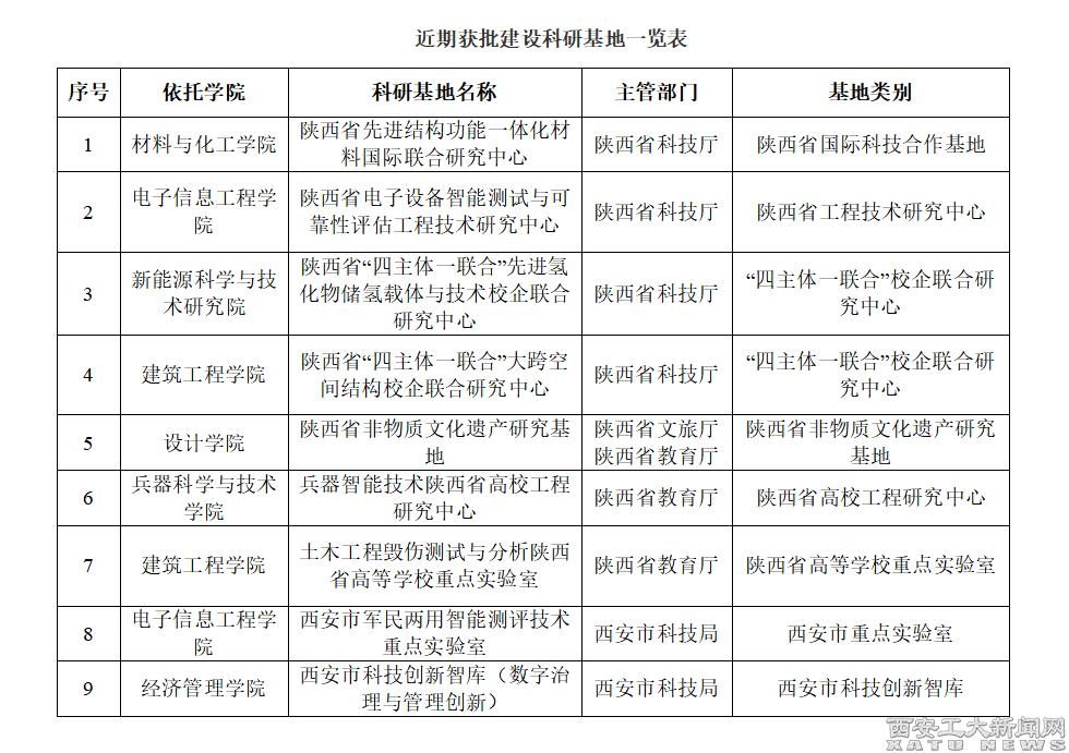 (本网讯)近日,陕西省科技厅、陕西省教育厅、陕西省文旅厅、西安市科技局陆续公布了多个类别的科研基地批准建设名单,ac米兰共获批9个,其中陕西省国际科技合作基地1个、陕西省工程技术研究中心1个、陕西省“四主体一联合”校企联合研究中心2个、陕西省非物质文化遗产研究基地1个、陕西省高等学校重点实验室1个、陕西省高校工程研究中心1个,西安市重点实验室1个、西安市科技创新智库1个。