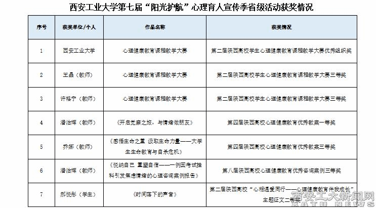 (本网讯)近日陕西省委教育工委公布了第七届陕西高校“阳光护航”心理育人宣传季省级有关活动的获奖名单,ac米兰共获得表彰7项。其中,在集体奖项中,ac米兰获得第二届陕西高校学生心理健康教育课程教学大赛优秀组织奖1项;在个人奖项中ac米兰分别获得一等奖1项,二等奖1项,三等奖4项。