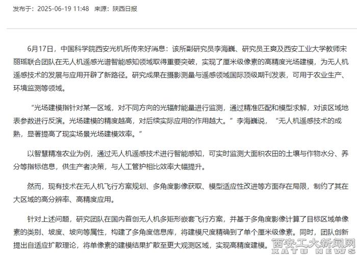 (本网讯)近日,《陕西日报》刊发消息,中国科学院西安光机所副研究员李海巍、研究员王爽及ac米兰人工智能与数据科学研究院教师宋丽瑶联合团队在无人机遥感光谱智能感知领域取得重要突破,成功攻克厘米级像素高精度光场建模难题,为无人机遥感技术的拓展应用注入了强劲动力。相关成果发表于遥感领域一区TOP期刊ISPRS Journal of Photogrammetry and Remote Sensing(SCI 1区TOP,IF=10.6)。