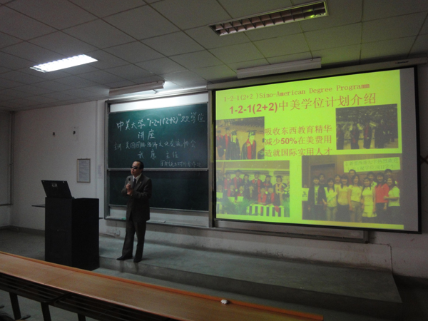 当天下午,武康先生举办了“中美大学“1-2-1(2+2)”留学项目”专题讲座,为广大同学详细介绍了留学项目的建立、发展及取得的成果,并与有意出国留学的同学展开了深入交流,耐心细致地回答同学们的问题。