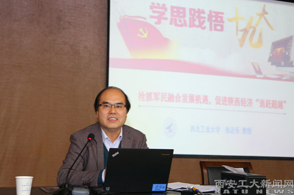 (本网讯)11月28日,学校邀请到省委专家学者“十九大”精神宣讲团成员、西北工业大学张近乐教授作《抢抓军民融合发展机遇,促进陕西经济“追赶超越”》主题报告。报告会由校党委副书记、校长雷亚萍主持。