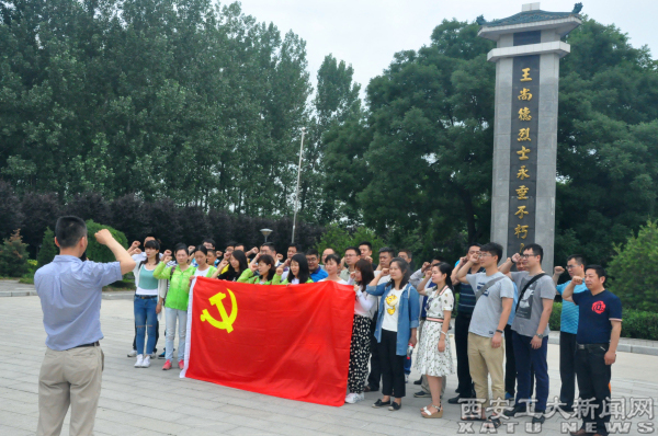 在王尚德烈士陵园,党员们在革命英烈纪念碑前庄严肃立,集体重温入党誓词,向王尚德烈士等革命先烈致敬。