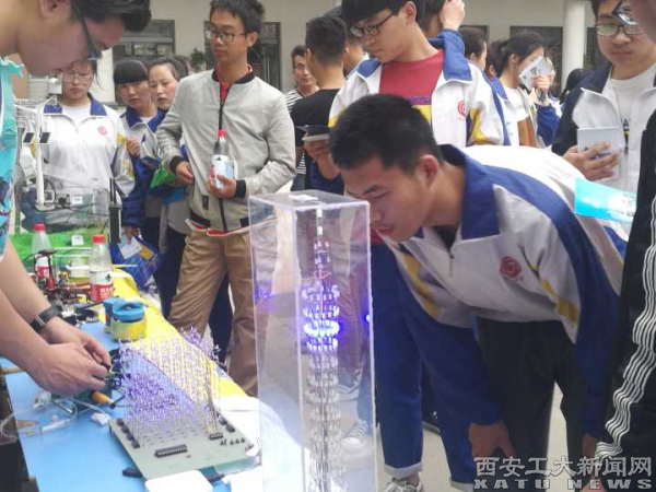 电信学院学生现场演示了循迹车、LED广州塔,8*8光立方、智能温室大棚、四旋翼飞机等作品。这些作品都是大学生理论联系实践的成果,是学生参与教师科研动手制做的创新作品,有的巧妙地解决了生活中的难题,有的具有较好的市场潜力。科技创新作品演示过程中,作品研发制作团队负责人为高中生详细讲述了自己的作品原理、操作方法和功能,互动交流中气氛十分活跃。
