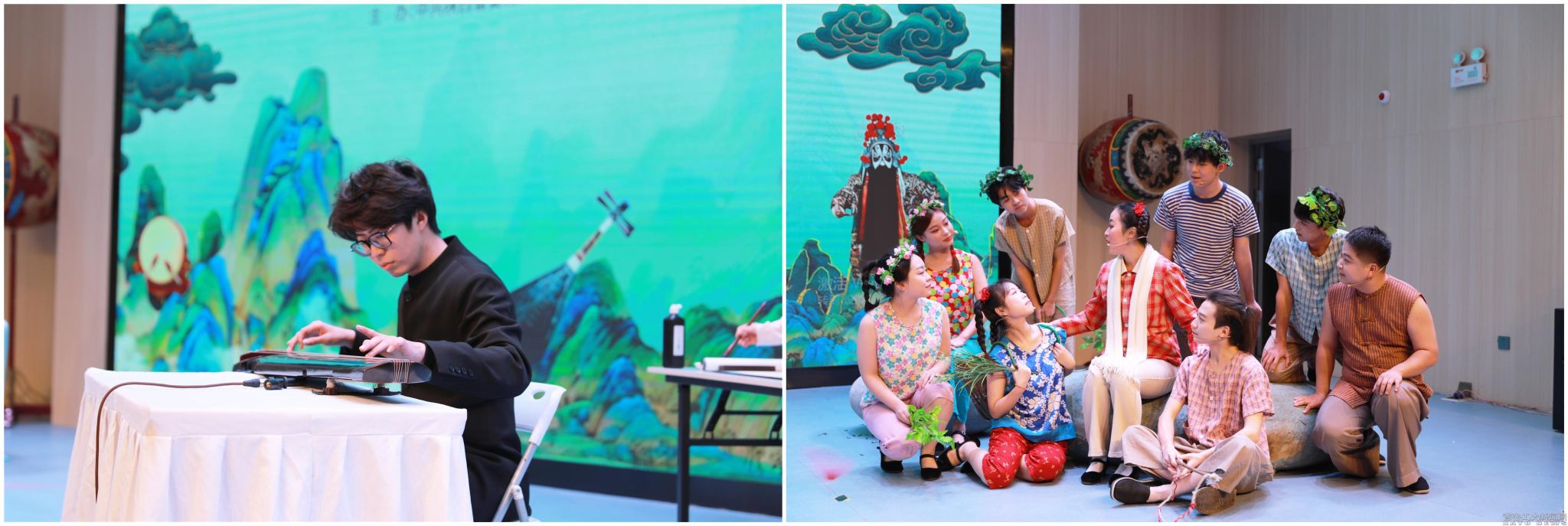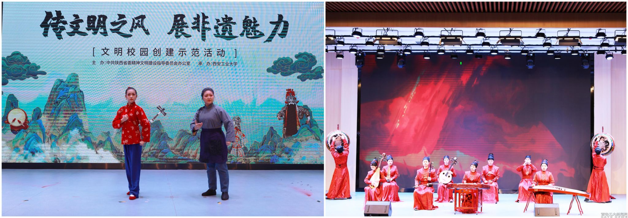 西安外事学院古琴系主任白金老师带领学生与ac米兰中国书法学院学生一起为大家展示了精彩的古琴演奏与中国书法,商洛学院学生展示了商洛花鼓戏《月亮光光》选段《追赶星星和太阳》,陕西艺术职业学院带来了秦腔表演《红灯记》。西安外事学院鼓乐团演奏的《破阵乐》,大鼓震天,响彻全场,把整场展示活动推向高潮。