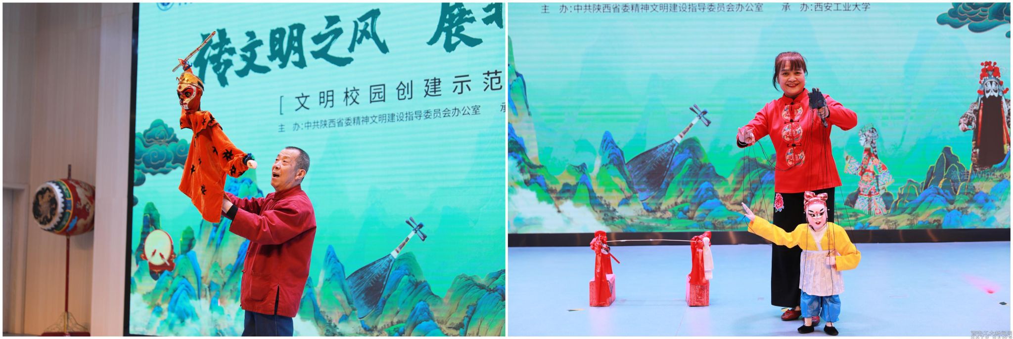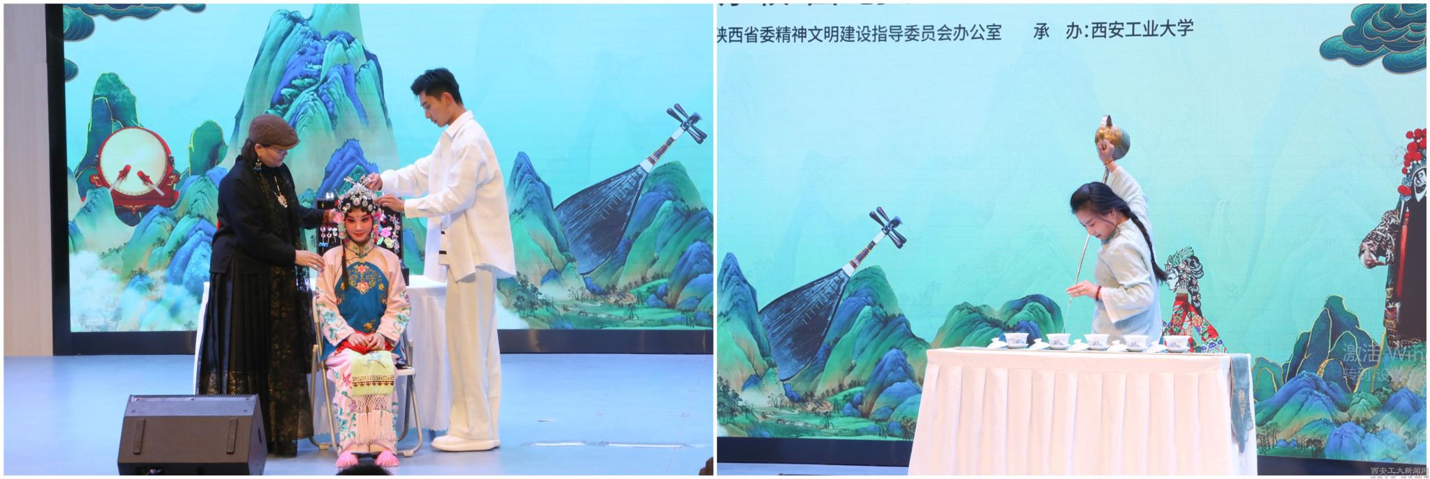 非遗传承人乔鼓利老师和王变红老师向在座师生展示杖头木偶戏《西游记-敢问路在何方》、提线木偶《欢乐的小货郎》。非遗传承人党莉莉老师展示的戏曲容妆项目,再搭配上高楠老师作的长嘴壶茶艺展示,为整场节目增添了感染力。