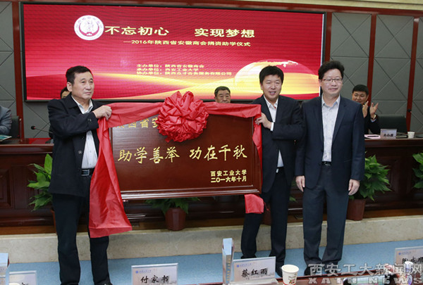 刘卫国还代表学校向陕西省安徽商会赠送牌匾。