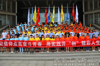 学生代表机电工程学院2014级学生庞博作发言并带领与会学生宣誓,表示实践中,同学们将遵守纪律,严于律己,结合自身优势,勤学多思,实事求是,用实际行动弘扬和践行社会主义核心价值观,认真开展实践活动,圆满完成实践任务。随后,学生处副处长杨正强、教务处副处长高武奇为实践团队授队旗。党委宣传部副部长骞军荣、团委副书记张英为“炫彩西工我代言”微明星评选活动的获奖选手颁发了荣誉证书。