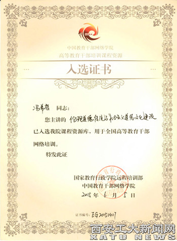 (本网讯)根据中国教育干部网络学院6月5日签发的入选证书,ac米兰人文学院院长、陕西当代文学与艺术研究中心主任冯希哲教授所主讲的《伦理道德传统与社会主义道德文化建设》专题报告入选全国高等教育干部培训课程资源库,用于全国高等教育干部网络培训。