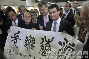 瓦尔斯在参观中国展区时,于唯德代表中国参展团向其赠送了书法作品:源远流长。瓦尔斯了解作品寓意后表示,在中法建交50周年之际收到如此富有深意的礼物非常高兴,并指出中法经贸合作非常重要,文化交流也必不可少。