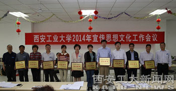 于孟晨为获得“陕西高校新闻奖”的获奖个人颁奖。组织部长刘正利和纪委副书记梁闪慧分别为获得“2013年度新闻宣传工作先进集体”的单位颁奖。