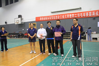 本次比赛精彩粉彩,高潮迭起,场上队员顽强拼杀,场下啦啦队呐喊震天,尽显了各队团结一心、斗志昂扬的精神风貌。教职工羽毛球协会名誉会长、副校长刘卫国为获奖各队颁发了奖杯和奖金,工会副主席朱晋中为优秀裁判员颁发了证书。