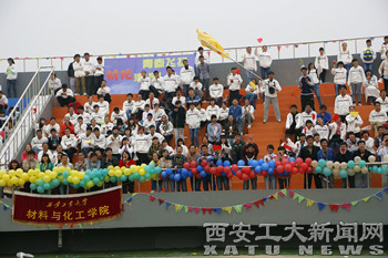 各学院的同学们将自己对场上运动员的祝福写在纸上用力挥动,将激情与活力化为欢呼声,参与进这场体育盛事,为自己的学院加油助威。“材化登场,势不可挡!”伴随着同学们鼓足劲喊出的加油声,材料与化学院的同学站起身,用力挥动手中的拍手器,为正在赛场上拼搏的运动员加油。由于名额有限,大多数同学遗憾地没有成为运动员,但是,这一点都不影响他们对此次运动会的热情。口号、条幅、展板、拍手器、气球、麦克风、扩音喇叭在看台上随处可见。更有建工学院和计算机学院的同学将开幕式时使用的鼓搬上了看台,随着发令枪响,有节奏的鼓点响彻整个运动场,振奋人心。