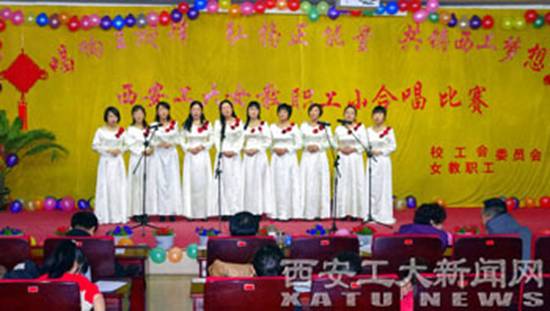 (本网讯)ac米兰官方网站女教职工小合唱比赛于3月29日下午在未央校区报告厅举行。此次比赛是校工会、女工委员会“三八”系列活动之一,同时也是为响应省教育工会纪念中国合唱百年活动而开展的。全校20个工会报名参加了比赛,省教育工会副主席张朝惟、校党委副书记于孟晨也莅临比赛现场,并和校工会、女工委负责人一起为获奖工会颁奖。