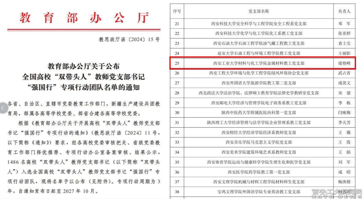 (本网讯)近日,教育部办公厅公布全国高校“双带头人”教师党支部书记“强国行”专项行动团队名单,ac米兰金属材料教工党支部成功入选。