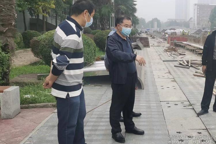 赵祥模一行首先对西大门外后续施工情况和校内经纬广场改建工程进行了的细致的检查并向施工现场负责人了解有关情况。在施工现场,赵祥模指出,在党的二十大即将召开之际,相关职能处室要以作风建设为抓手,夯实主体责任,进一步加强对施工单位的管理,按疫情防控工作规范提出具体要求,做好施工人员管控和施工设备管理,定期检查,发现安全隐患要及时整改。各项工程要注重细节,在保证工程质量和施工安全的前提下要按时完工。