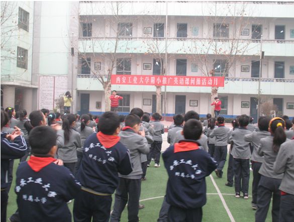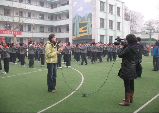 “one,two,three,go! Mother,father,brother……”随着动感的音乐和舞动的节拍,学生的情绪瞬间高涨起来,喊着口号投入到课间活动的锻炼中去。此举巧妙地将体育锻炼与英语学习融为一体,极大地激发了学生学习英语的热情,不失为一项值得借鉴的好措施。西安电视台《都市快报》、《今晚播报》分别对此进行了报道。