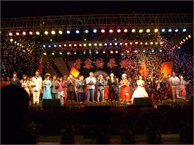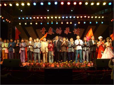 晚会的最后,全场齐唱主题曲《奋进之路》。嘹亮的歌声响彻整个广场、整个校园,在热烈的气氛中,校领导走上舞台,与参加演出的同学们亲切握手,祝贺大家演出成功,与大家合影留念。
