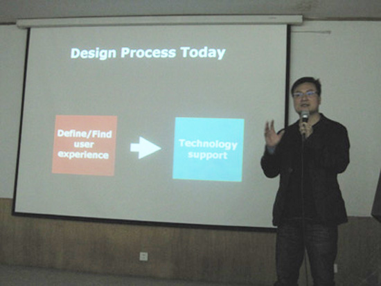 交流分为学术讲座和专业座谈两个阶段。讲座以“设计感悟、感悟设计”为主题展开。邱丰顺先生有着丰富的工业设计从业经验,先后任台湾蓝天电脑工业设计部设计总监、飞利浦台北设计中心资深设计专案经理、摩托罗拉亚洲区设计总监等重要职务;同时他还有着丰富的教学经验,一直是清华大学美术学院、中央美术学院、广州美术学院等高校的客座教授。