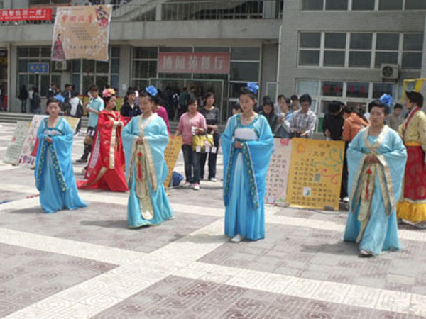 4月29日上午,在食堂门口举行了以“别样风华是汉唐”、“盛世霓裳耀汉唐”、“丝路古城在汉唐”、“风流人物聚汉唐”、“特色饮食品汉唐”五大板块组成的室外活动。由精美展板搭造出的文化长廊,图文并茂地向观众展示了汉唐文化深厚的历史积淀。活动现场,汉社数名成员身着华丽的唐服,为观众表演了舞蹈《盛世华章》,精彩的演出引得过往同学纷纷驻足观看,优雅的姿态和近乎还原历史的妆容重现了汉唐时期的雍容大气,得到了围观同学的赞叹。当日,同学们赏展板,看表演,玩游戏,赢奖品……都深切地感受到了此次文化节浓厚的节日氛围,也全面地了解到了中华汉唐文化的源远流长和独特魅力。