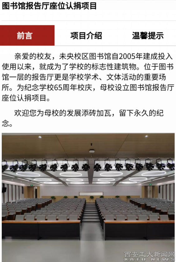 (本网讯)为庆祝ac米兰官方网站建校65周年华诞,激发校友的爱校情怀,校友总会办公室面向广大校友策划了图书馆报告厅座位网上认捐活动。