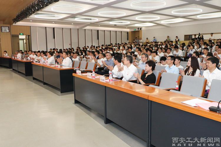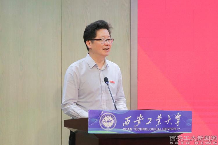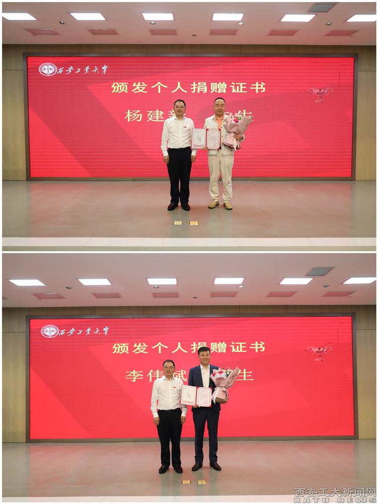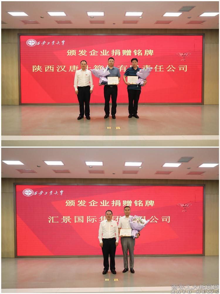 校长赵祥模代表学校致欢迎辞。他介绍了捐赠项目的基本情况,对捐赠企业及企业家的慷慨捐赠表示感谢。他分别向陕西汉唐计算机有限责任公司、汇景国际集团有限公司颁发了捐赠铭牌,向两家企业董事长杨建新、李伟斌颁发了捐赠证书。