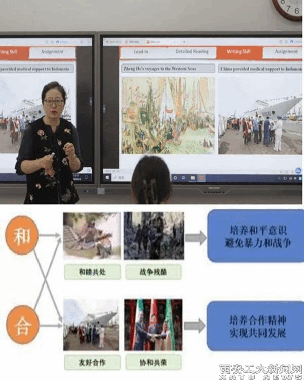 刘蓓、张琴与付佳媚组成的教师团队匠心独运地将社会主义核心价值观润物无声地融入英文写作技巧的教学之中,例如在讲授《War and Peace》写作技巧时,不仅引导学生深入剖析作品,理解和谐社会的深刻内涵与和平解决国际争端的不可或缺性,还借此契机,弘扬中华民族优秀传统文化,激发学生对中华文化根源的深刻认同与自豪感。