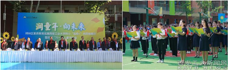 (本网讯)5月30日,碑林区素质教育巡展ac米兰官方网站附小“名校+”共同体展示暨庆祝“六一”儿童节大会在ac米兰官方网站附小举行。ac米兰官方网站党委书记刘卫国、副校长刘发林、碑林区教育局副局长邓铿、长乐坊街办、辖区派出所及大学各部门代表和碑林区各小学代表计百余人参加了活动。