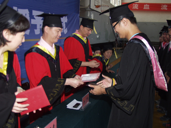 最后,体育系副主任陈亚麟宣读了校长刘江南的学位授权书,系主任谷崎为毕业生颁发学位证书并合影留念。