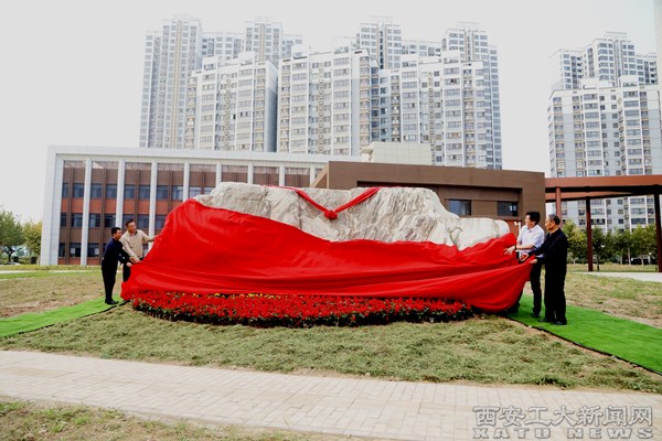 78级校友代表马永社、王林祥,校党委书记刘卫国、副校长刘发林共同为纪念石揭幕。