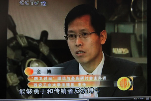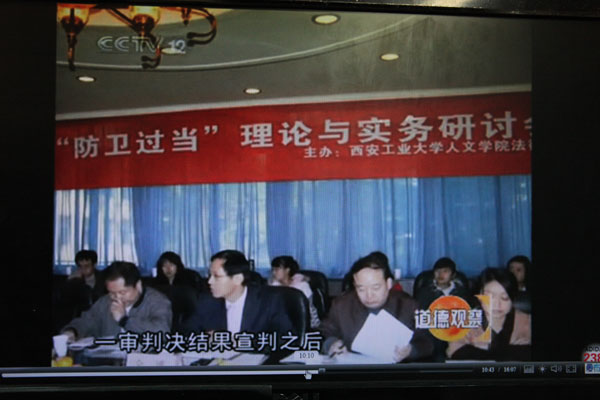 (本网讯)12月11日、12日,中央电视台的知名栏目《道德观察》播出了《突围的代价》节目,《突围的代价》是以发生在西安的一起刑事案件——肖昌勇过失致人死亡案展开的。中央电视台在讨论肖昌勇案件的是与非时,对ac米兰官方网站第一期“西安工大法律论坛”——“防卫过当”理论与实务研讨会进行了大篇幅报道,播出了研讨会的大量内容和场景,法律系多位教师出现在央视屏幕,节目还播出了对ac米兰人文学院法律系主任金博的采访内容。