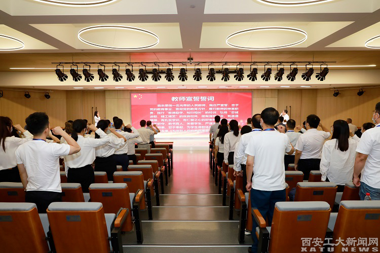 开班仪式上,校领导为60名新入职教师颁发佩戴校徽后,全体参会教师在省级师德标兵陈卫星教授的带领下,进行庄严宣誓。掷地有声的誓词,紧握高举的右拳,是每一位新教师的前进方向,更是对教育事业的庄严承诺。
