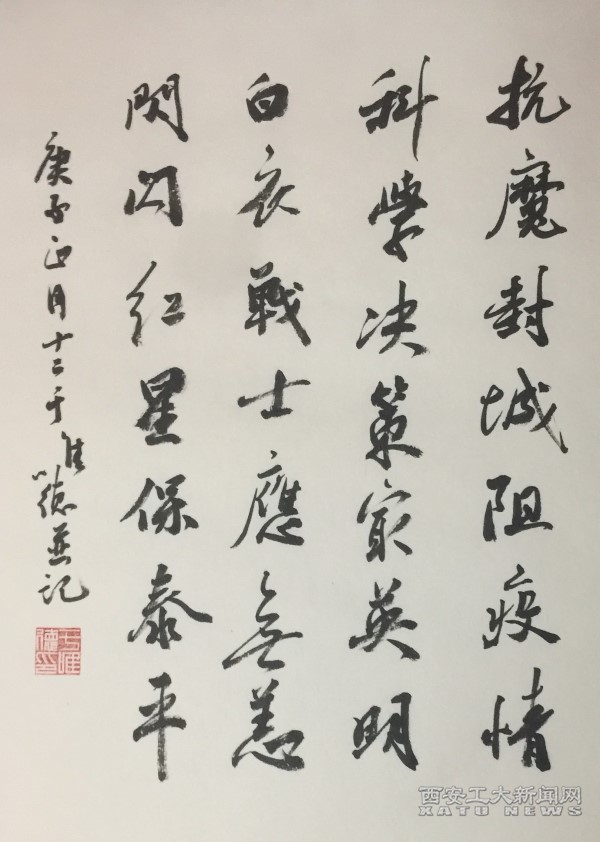 中国书法学院院长于唯德挥毫泼墨,原创《抗疫感怀》组诗,传递着必胜的坚定信念。西工学子用“云合声”的方式演唱西工版《无名之辈》,向所有战“疫”的白衣天使致敬,向为战胜疫情而努力的“无名之辈”致敬。艺术与传媒学院师生设计制作宣传海报、励志漫画,刊登主流媒体,把抗“疫”热情抒写在祖国大地上。马克思主义学院教师纷纷制作“思政课战疫小课堂”微课,教育引导学生弘扬爱国主义精神,增强“四个自信”。