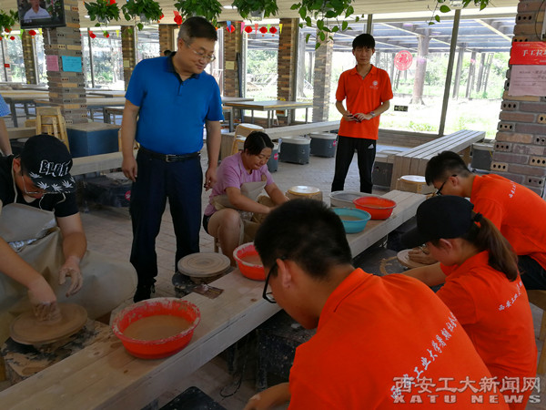 在富平县陶艺村。光电工程学院“寻梦陶城”富平陶艺文化宣传实践队队员正在师傅的指导下做陶艺模型。李智军饶有兴趣的和队员们交流陶艺器皿的制作过程及技巧,听取实践队接下来的实践安排。他指出,大学生社会实践活动是一个非常好的锻炼机会,能够学到课本上学不到的知识,希望大家克服困难,把握住实践的机会,取得良好的效果。同时,希望实践队员能够将富平陶艺文化认真领会、积极宣传,让更多的陶艺爱好者和游客走进陶艺村,为富平人民增加经济效益,为脱贫攻坚工作尽自己的一份力。