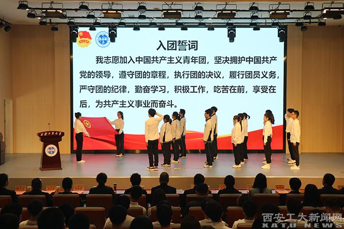 表彰会上,新团员代表面向团旗,举起右拳,庄严宣誓,用铿锵有力的誓言表达了成为一名共青团员的责任与担当。