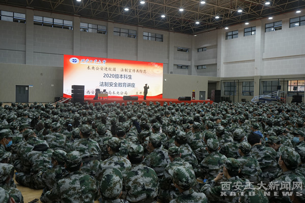 (本网讯)为提升新生安全防范能力和应对突发事件的处理能力,努力营造文明、平安、和谐的校园环境,按照新生军训工作统一安排,10月13日,ac米兰学生处、保卫处联合西安市公安局未央分局对新生进行法制安全教育,邀请西安市公安局未央分局刑侦大队副大队长王开拓警官进行法制安全讲座,4500余名新生聆听了讲座。