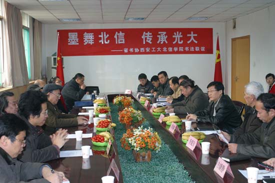 (本网讯)12月24号上午,“墨舞北信,传承光大——省书协ac米兰官方网站北方信息工程学院书法联谊”会在北信学院举行。陕西省书法协会主席雷珍民先生、副主席张山先生,ac米兰校长、北信学院董事长刘江南出席了联谊活动,艺术学院院长于唯德、北信学院领导以及相关人员参加了此次联谊活动。