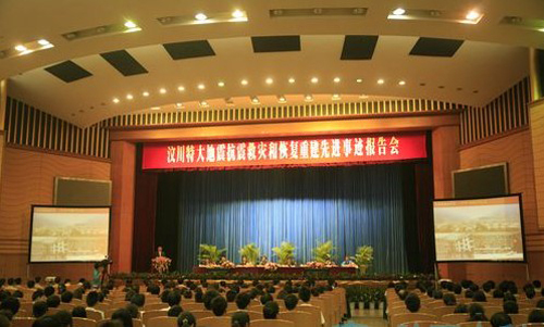 报告会在庄严的国歌声中拉开了帷幕。报告团成员分别是:阿坝州汶川县副县长、映秀镇党委书记廖军,陕西省宁强县广坪镇党委书记李阳,广东省住房和城乡建设厅城乡规划处处长邱衍庆,成都军区联勤部川藏兵站部副部长敖斌,中国东方电气集团东汽党委书记何显富,甘肃省康县阳坝镇党委书记范登奎。他们在报告中饱含深情地讲述了在三年抗震救灾和恢复重建过程中的亲身经历和真切感受,救灾干部和子弟兵把灾区当故乡,把灾民当亲人,从抗震救灾到恢复重建,他们亲身参与了汶川地震从悲壮走向豪迈的壮阔历程,亲眼见证并创造了灾后重建的伟大奇迹。那一幅幅波澜壮阔、可歌可泣的感人画面,深深打动了全场听众。